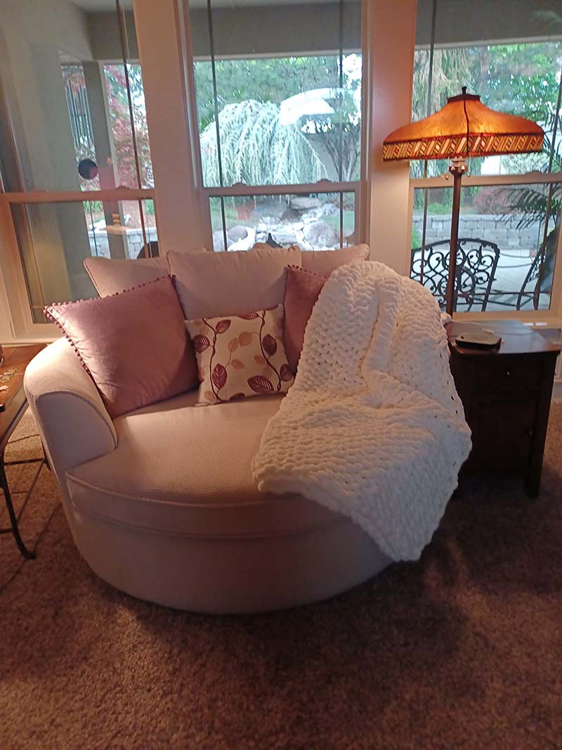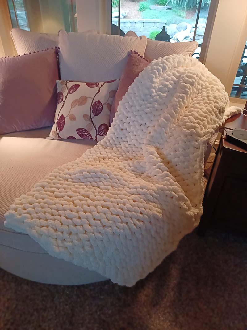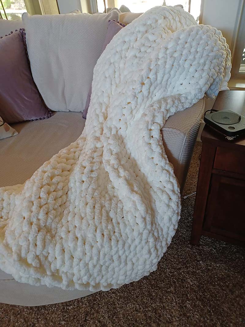 This blanket is absolutely beautiful and so soft. The cream shade goes perfectly with the creamy beige chair for a cozy and inviting accent to my family room. Doubled up it is so warm on the chilly mornings, yet unfold it for a lighter feel of warmth. The chunky knit adds a lovely texture to the room, so it will be on display year round. The quality is exceptional and it was a wonderful mother's day gift from my hubby. Highly recommend!