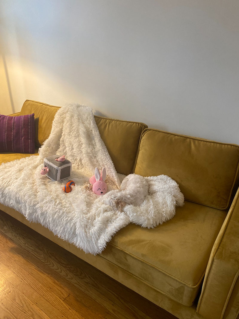 Can you spot my pup or does she blend in too nicely with this gorgeous blanket? It is uber soft, comfy and luxurious. It looks very chic with my gold velvet sofa and, most importantly, the elderly pup I just adopted settled right into it! It is apparently quite washable (although I haven't washed it yet and I very much hope it retains it softness!) and keeps my couch clean and my pup happy! We lounge here all the time. This one seems pretty sturdy and is super affordable! Highly recommend, esp for anyone whose pets love fluffy blankets.